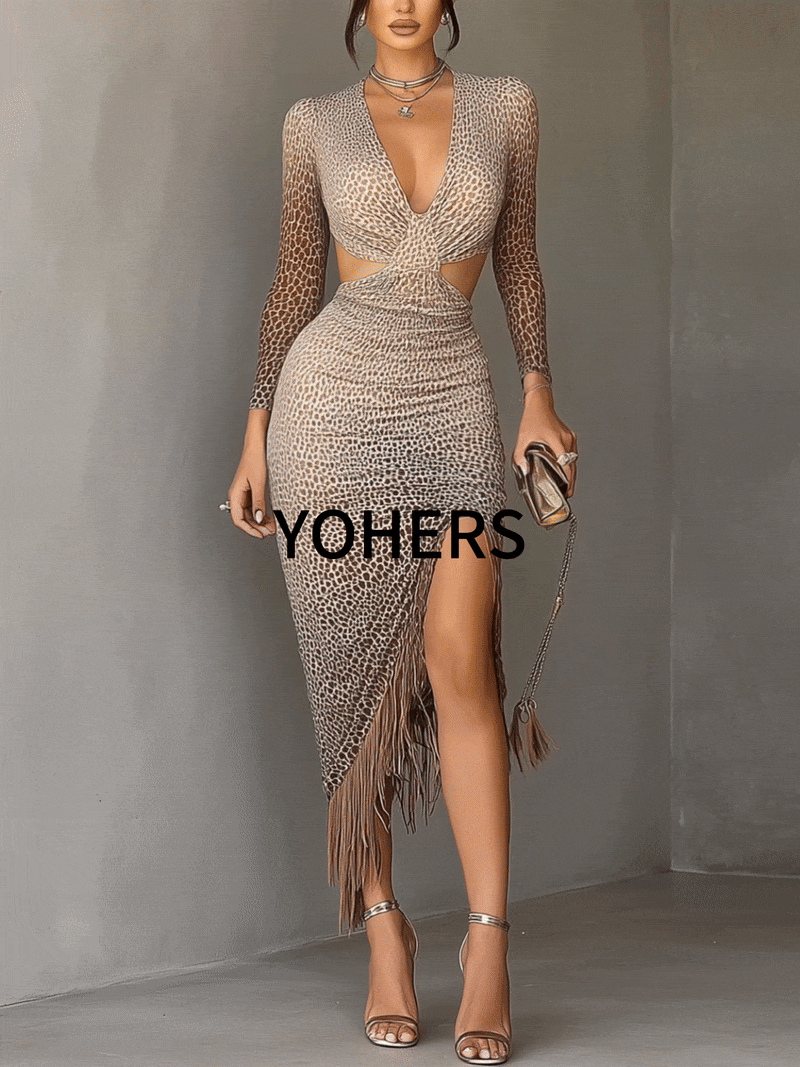 KEY FEATURES: Material: Crafted from a stretch-knit fabric with an exotic leopard print, offering both comfort and a sleek, body-hugging fit. The material has a smooth touch and subtle sheen, perfect for standing out effortlessly. Design: This dress showcases an eye-catching twist-front bodice with a deep V-neckline and strategic cutouts at the waist for added allure. Long fitted sleeves balance the bold cuts, while the asymmetrical hemline features playful fringe tassels and a high slit for dramatic movement. Fit: Tailored to flatter the feminine figure, the contoured bodycon silhouette hugs the curves with precision, creating a confident and alluring profile. Suitable Occasions: Ideal for evening events, rooftop parties, club nights, or upscale dinners where you want to make a bold, fashion-forward statement. Care Instructions: Hand wash gently in cold water or dry clean to retain fabric elasticity and vibrant print. Avoid tumble drying to preserve the fringe detailing. Sizes : S, M, L, XL, 2XL,3XL. This sultry leopard-print dress blends wild elegance with contemporary edge. The twist-front design adds a sculptural effect, while the waistline cutouts and thigh-high slit bring out a daring femininity. The fringe hem adds an unexpected bohemian twist, creating graceful movement with every step. Style it with metallic heels, a sleek clutch, and bold, layered jewelry for a high-impact look. Perfect for fashionistas looking to turn heads at their next stylish outing.
