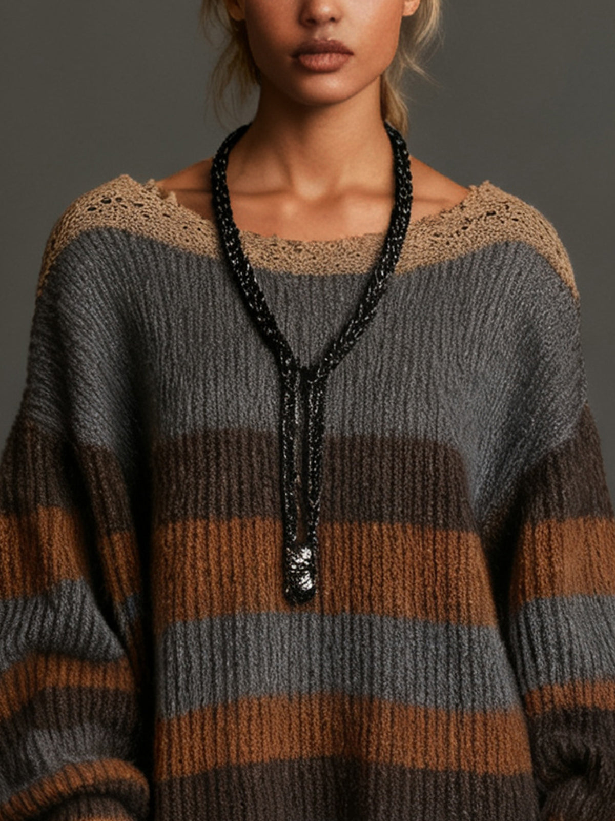 KEY FEATURES: Material: This dress is made from a soft, knitted fabric that ensures warmth and comfort. The intricate beige lace trim adds a touch of elegance and contrast to the cozy design. Design: Featuring a mix of earthy tones in a striped pattern, the dress exudes a warm, autumnal vibe. The decorative lace edging at the neck, cuffs, and hem enhances its sophisticated look. Fit: The relaxed fit provides versatility and ease of movement, allowing for both style and comfort. Its oversized sleeves contribute to the casual, chic silhouette. Occasion: Perfect for casual outings or relaxed gatherings, this dress seamlessly combines laid-back charm with fashionable detailing, ideal for a variety of settings. Care Instructions: For longevity, hand wash in cold water and lay flat to dry, preserving the knit’s softness and lace detailing. Sizes: Available in sizes XS, S, M, L, XL,2XL,3XL. The striped knit dress with beige lace trim adds sophistication to everyday wear. Its combination of cozy knit and delicate lace makes it a versatile piece for transitional seasons. Pair with ankle boots and a leather bag for a complete, stylish ensemble. Layer it with a scarf or a cardigan for additional warmth and flair during cooler days.